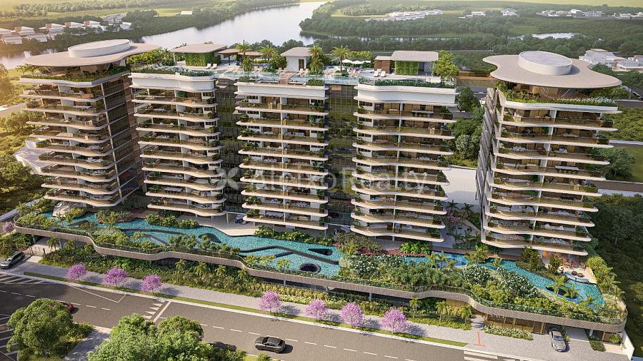 Idealizado pelos renomados Pretti Arquitetos, o Salt apresenta uma fachada moderna e atemporal, onde a arquitetura contemporânea encontra um paisagismo exuberante assinado por Benedito Abbud. As três torres residenciais – A, B e C – conectadas entre si, formam uma composição visual de impacto, abraçada por um cinturão verde que valoriza o entorno e promove privacidade sem abrir mão da convivência.