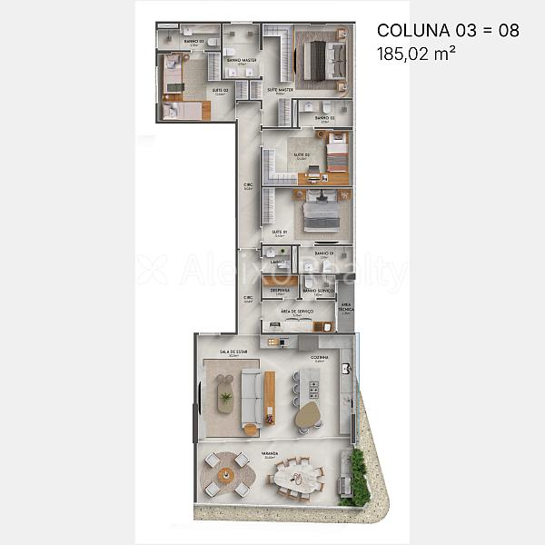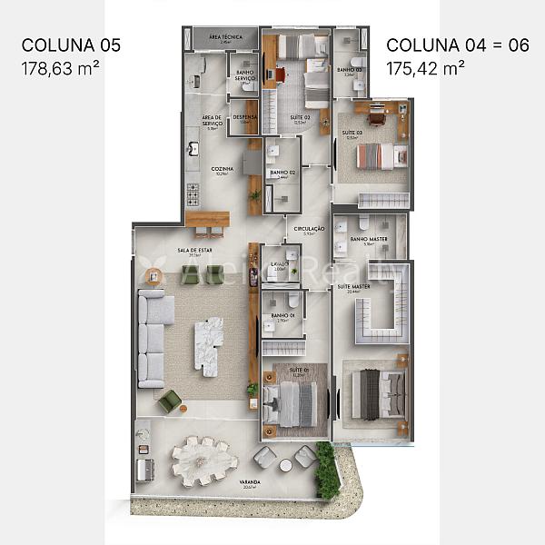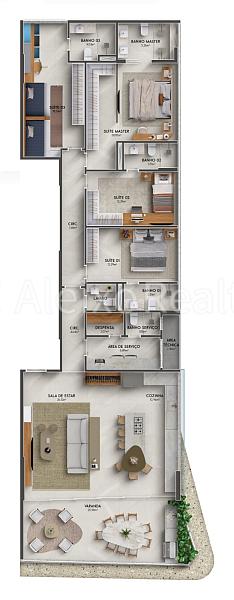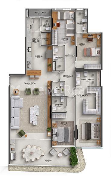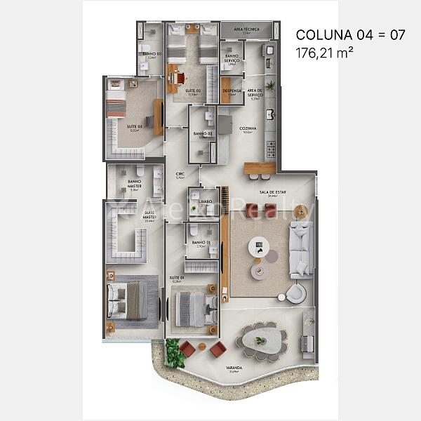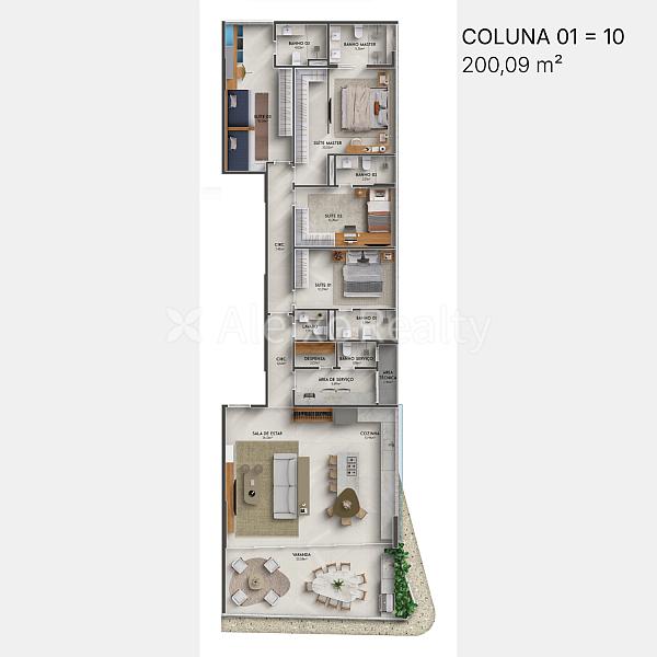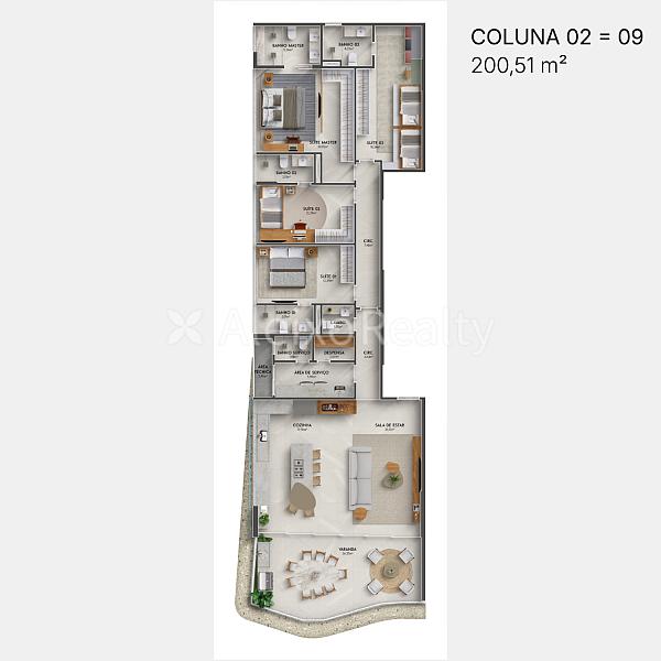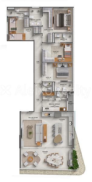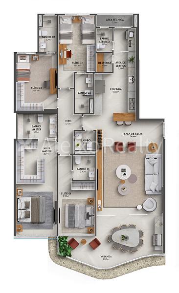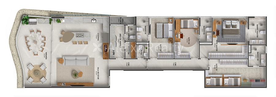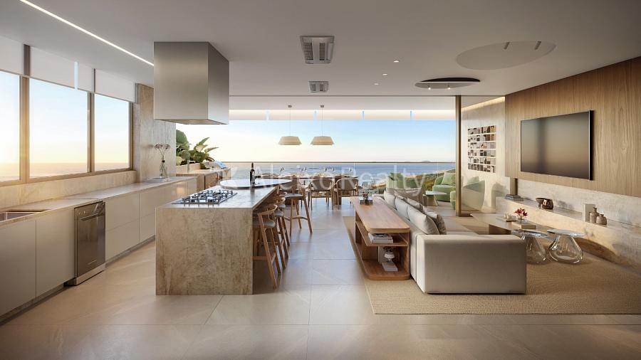 Cada apartamento do Salt é um verdadeiro refúgio, projetado para valorizar a integração e o convívio familiar. Com 4 suítes amplas e voltadas para a frente, as unidades contam com sala integrada à cozinha, varanda gourmet com bancada, circulação, lavabo, área de serviço, despensa, banheiro e área técnica. A suíte master se destaca por sua exclusividade, oferecendo dois pontos de chuveiro para maior conforto.