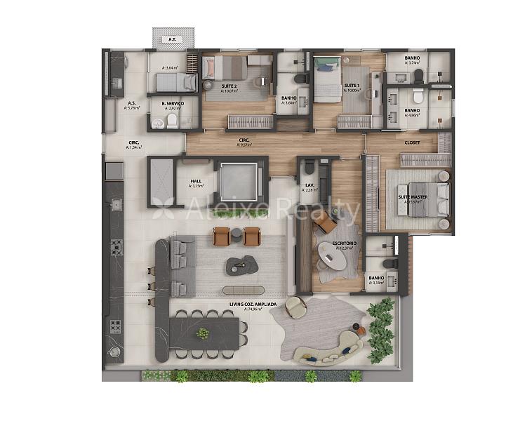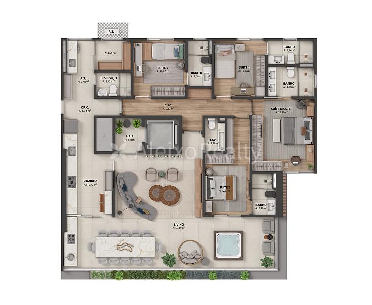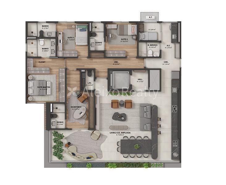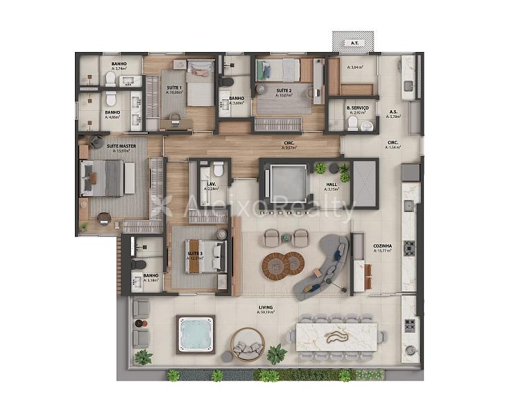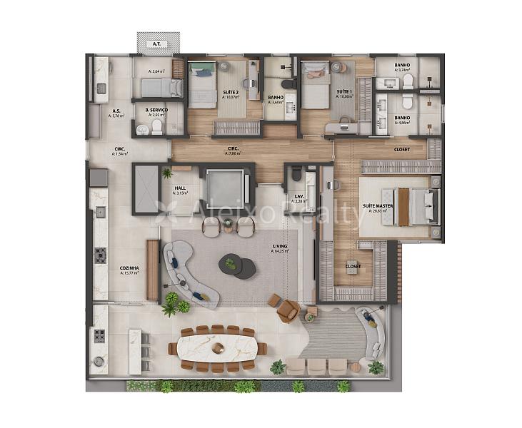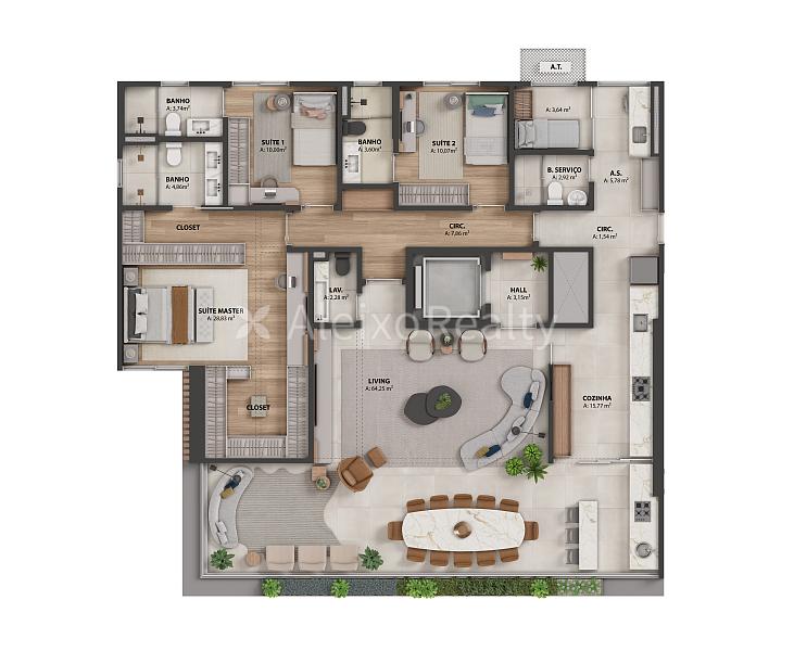 • 4 suítes com áreas privativas entre 188,75 m² e 572,05 m²