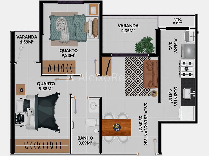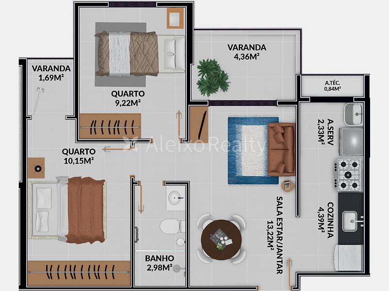 Os apartamentos do Monte Athos possuem até 50,88m², com plantas inteligentes e ambientes bem distribuídos. As opções incluem unidades de 2 quartos, com ou sem suíte, todas com varanda privativa e vaga de garagem.