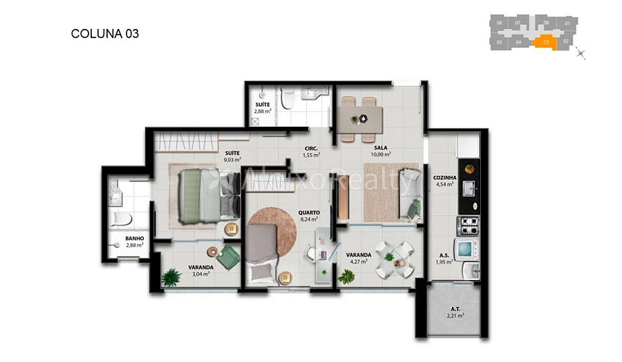Com apartamentos de 2 quartos, sendo uma suíte, e área privativa de 58,15 a 59,05 m², o Brisa Boulevard oferece vista privilegiada para o mar e localização estratégica, em frente ao Shopping Boulevard e próximo às praias e comércios locais.