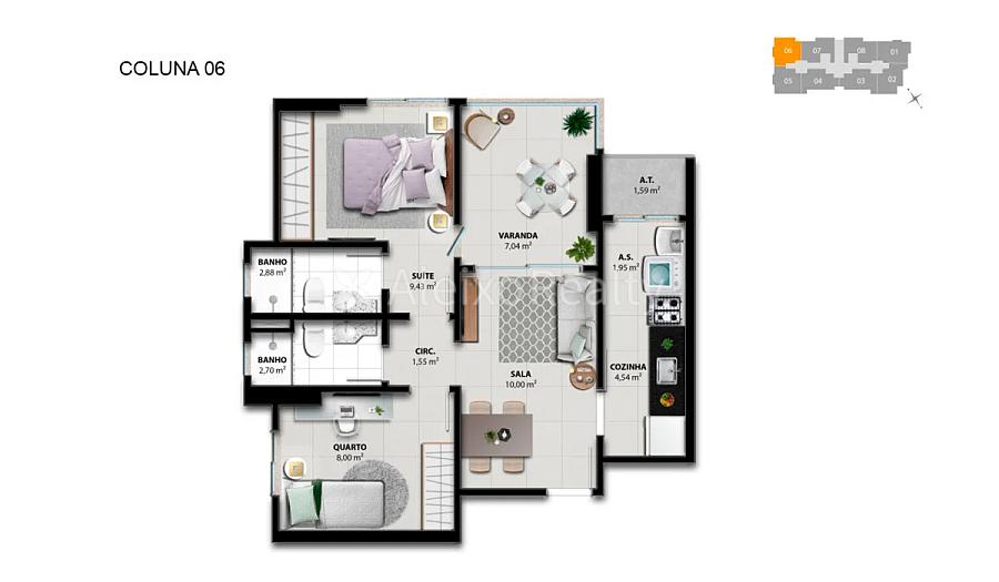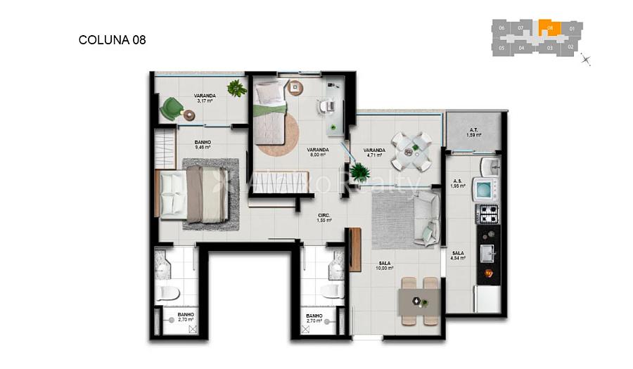 Áreas: 58,15 a 59,05 m²