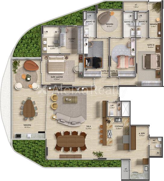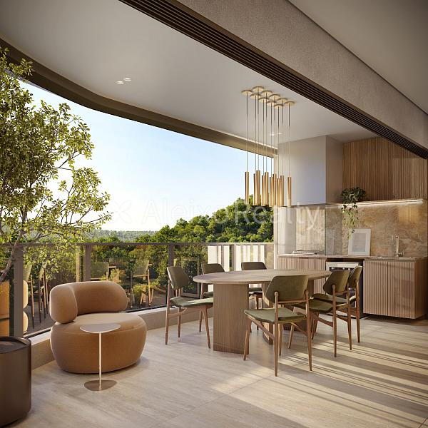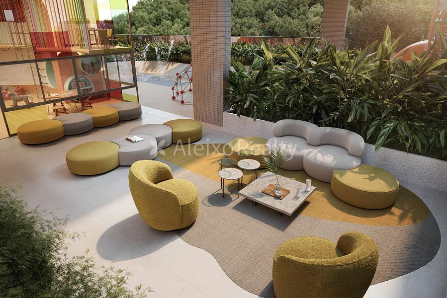Todas as unidades contam com sala integrada à cozinha, lavabo, área de serviço, WC de serviço e varandas amplas com infraestrutura gourmet.