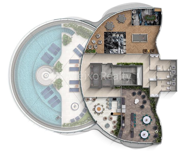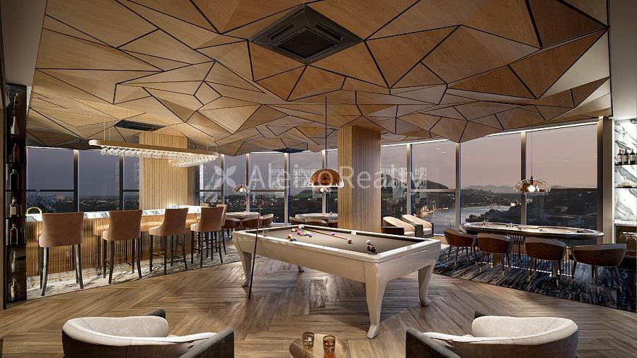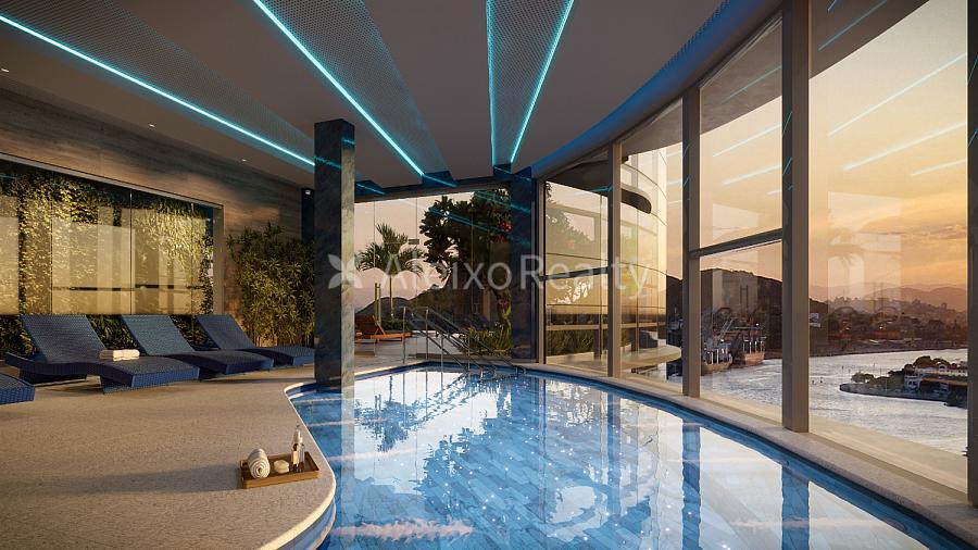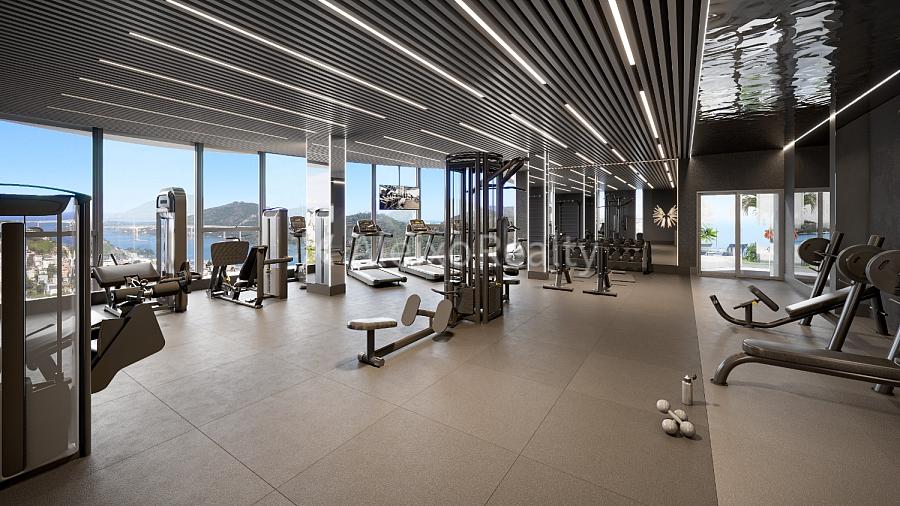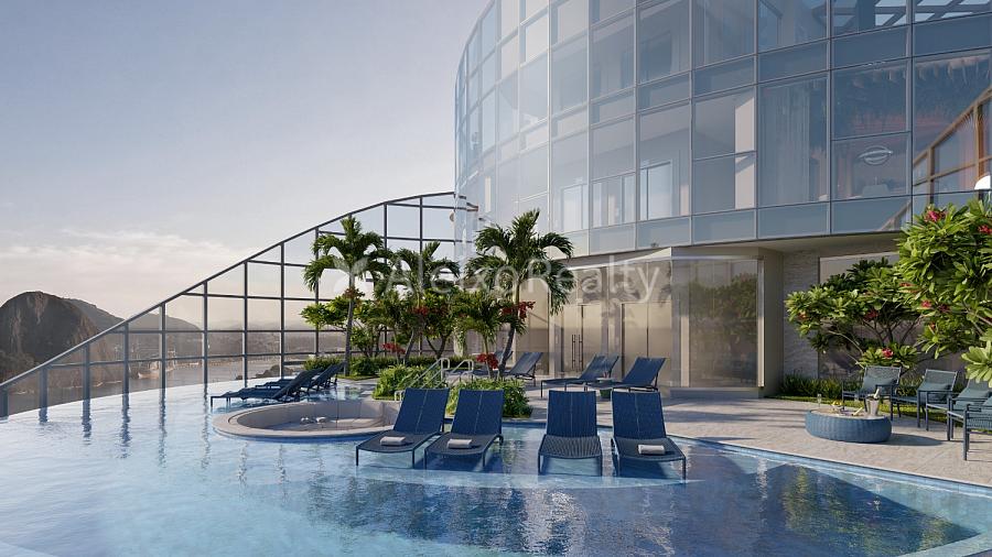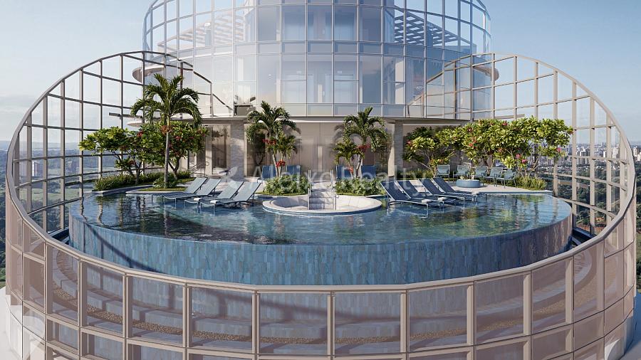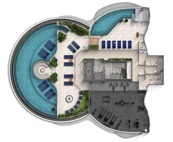 • Cobertura (35º ao 37º andar): piscina de borda infinita com decks molhado e seco, lounge, academia completa, sauna, spa com piscina aquecida, dois espaços gourmet (confraria e grill), pub com vista panorâmica, sky gardens com champanheira e mirantes para Vila Velha e Guarapari.