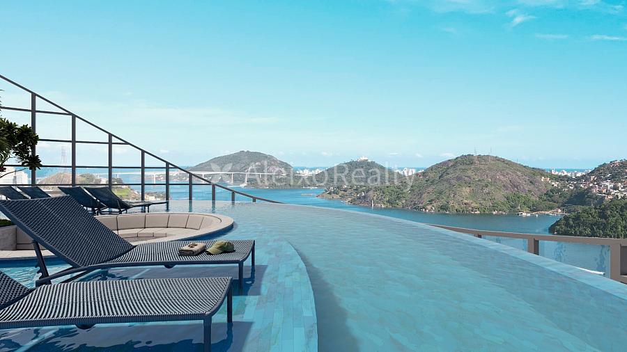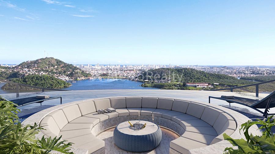 A vista é de tirar o fôlego: Morro do Penedo, Porto de Vitória e o Convento da Penha se exibem emoldurados pelas paredes de vidro que levam a luz natural e a beleza do entorno para dentro do seu lar.