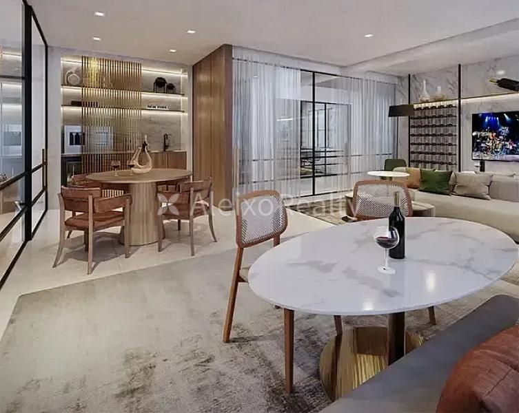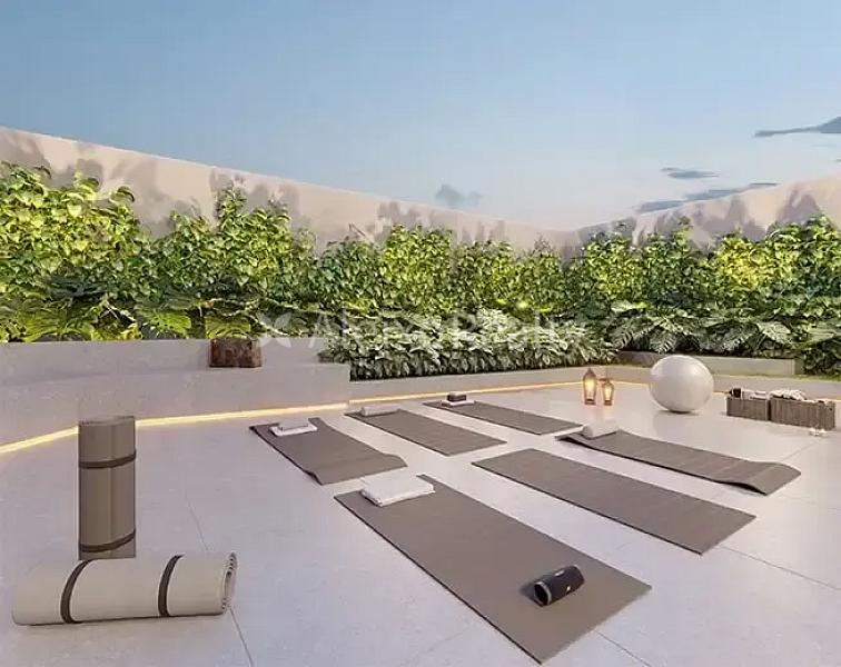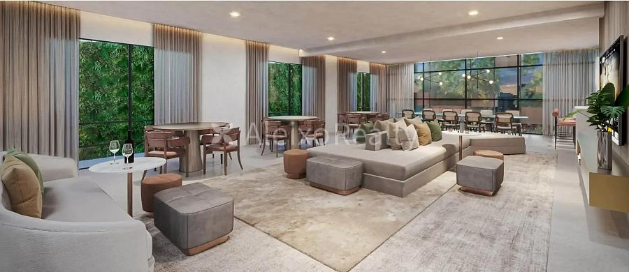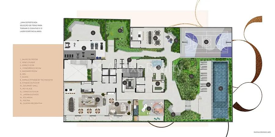 A área de lazer é inspirada em resorts internacionais e oferece piscina com vista panorâmica, wine lounge, spa, espaço fitness by Technogym, brinquedoteca, pet place, quadra recreativa, entre outros.