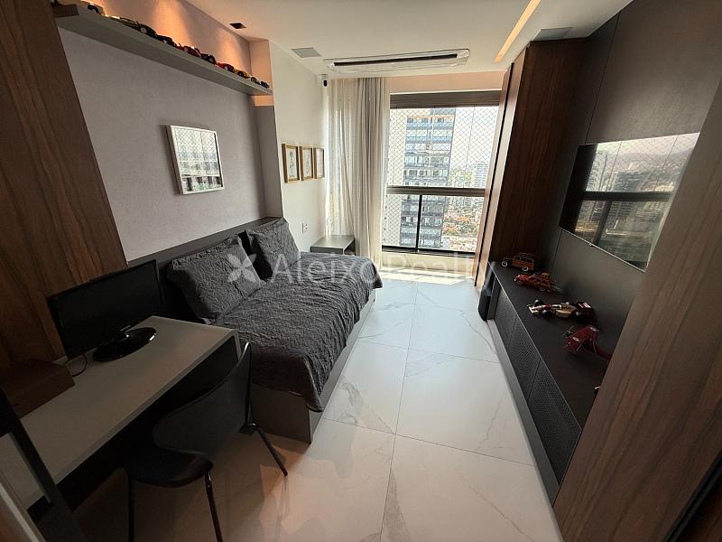 Com sala de TV e espaço gourmet integrados, a área é equipada com automação completa — controle total de iluminação dimerizada, ar-condicionado, cortinas, som, TV e teto retrátil.