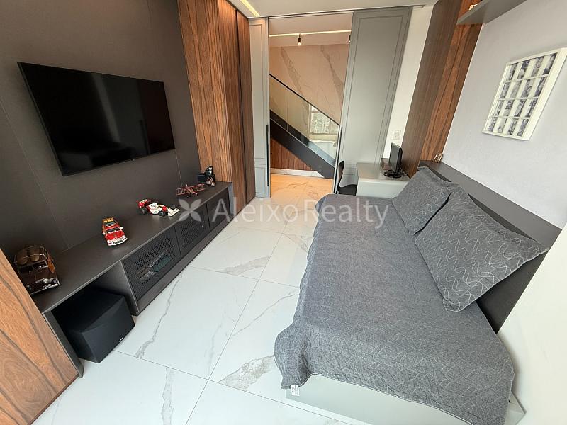 A escada em granito Via Láctea conecta os ambientes com elegância, e todos os cômodos são climatizados com ar-condicionado tipo cassete embutido, garantindo conforto em qualquer estação.