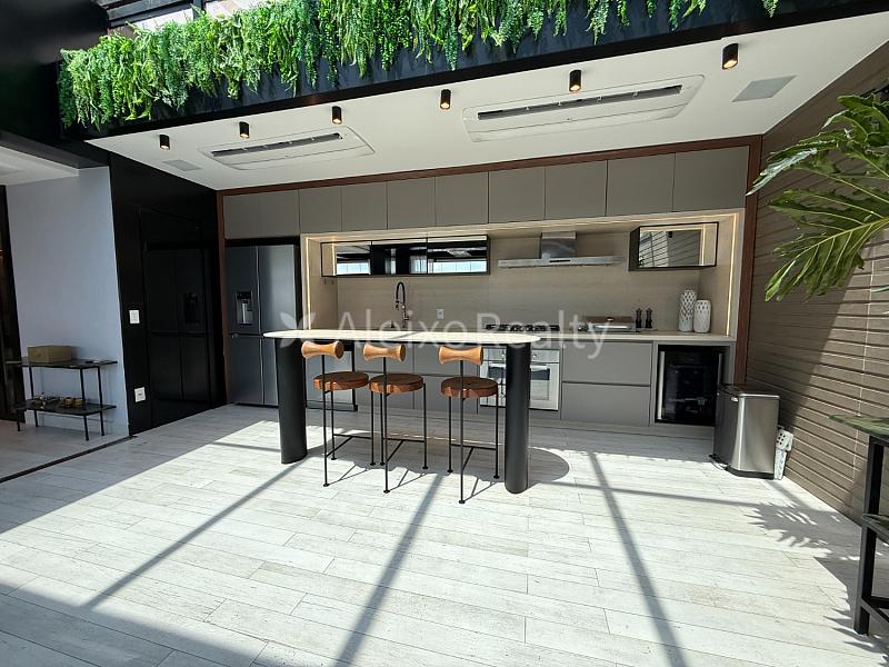 O espaço gourmet conta com eletrodomésticos premium, como geladeira side by side, forno Philips, cooktop Brastemp, lava-louças e máquina de lavar.