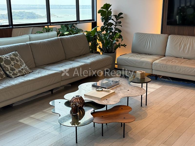 O mobiliário é uma curadoria de design: sofá de couro Natuzzi de 7 metros, mesa de centro Sette7, mesa Sacaro para 5 lugares, e aparadores em quartzito Vitória Régia.